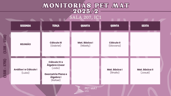 Observação: A sala do PET Matemática somente fica fechada na segunda-feira, a partir de 15:00h até as 17:00h, devido a reunião administrativa do grupo. Nesse sentido, exclusivamente para esse dia e horário, não há a oferta de monitorias.